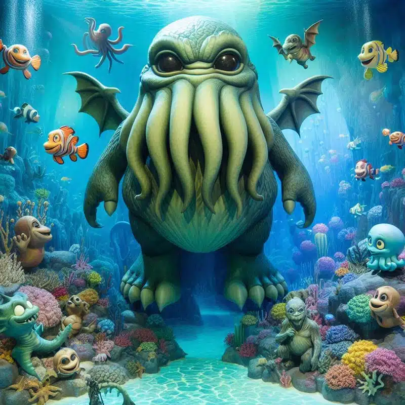 In unserem Fall fragen wir uns also stattdessen: Wie sieht diese Figur eigentlich aus? Lovecraft beschreibt ihn nur rudimentär als tintenfischähnliches Wesen mit Flügeln. Um keine Rechte zu verletzen, haben wir – ausnahmsweise – gleich zwei KIs gebeten, uns ein Bild von der Figur zu zeichnen, und die Ergebnisse von Adobe Firefly (Links) und Microsofts CoPilot rechts sind ausnahmsweise einigermaßen stimmig bzw. konsensfähig, wenn auch das Tintenfischmännchen von Microsoft etwas zu niedlich geraten ist, und der Adobe-Fassung die Flügel fehlen. Für einen ersten Eindruck mag es genügen.